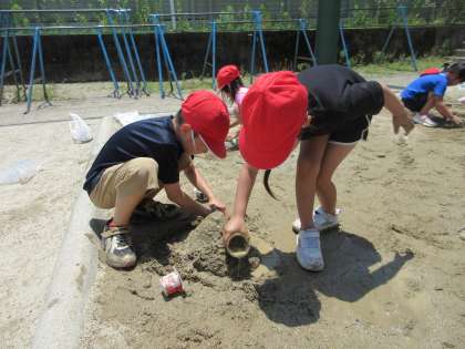 いつのまにか、子どもたち同士で協力し合っている姿が見られました。ひたすらバケツに水を入れて運ぶ熱心な姿も。ずっと夢中になって遊ぶ子どもたちでした。いつまでもいつまでも遊べそうでしたが、給食が始まるのでおしまいにしてもらいました。