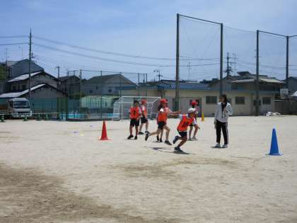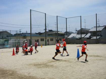 チームでどれくらいの速さになるのか、タイムを計りました。前の自分たちの記録を超えようと、バトンパスを工夫したり、順番を考えたりしながら、みんなでがんばりました。