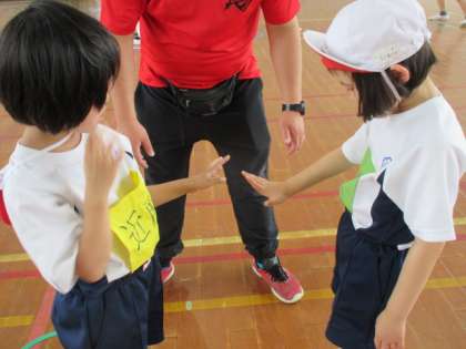 今日の体育では、「けんけんパ」でどんじゃんに取り組みました。