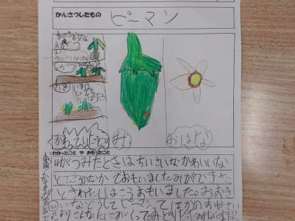 6くみは、生活科の時間に6くみばたけで育てている野菜の観察をしました。学年によっては、交流学習で育てているアサガオやホウセンカの観察をしました。