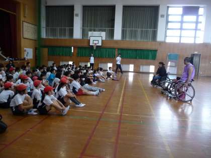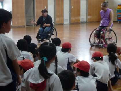 車いすバスケットの選手の方にご来校いただき、お話を聞くことができました。