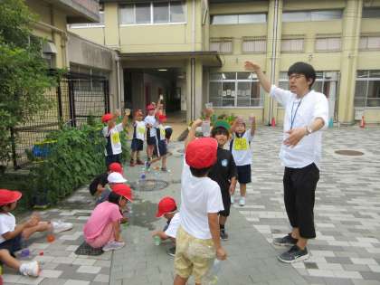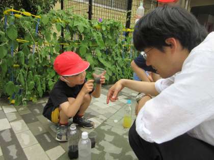 どんな色ができたか、先生にお話しする子どももいました。「先生、見て見て!」と言う子がたくさんいました。