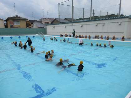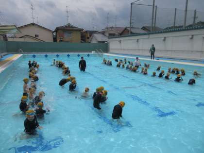 今日は1学期最後の水あそびでした。初めは、顔や頭に水がかかることをこわがっていましたが、何回かプールで学習をすることで、大丈夫になってきた子どもがたくさん増えました。
