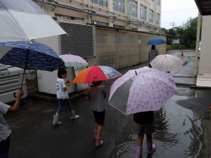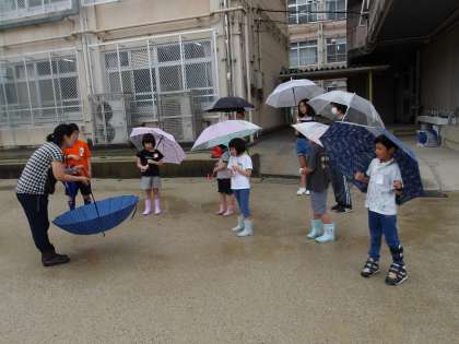 梅雨真っただ中の今日、6くみは長靴やサンダルを履き、傘をさして、「雨降り」の体験に行きました。