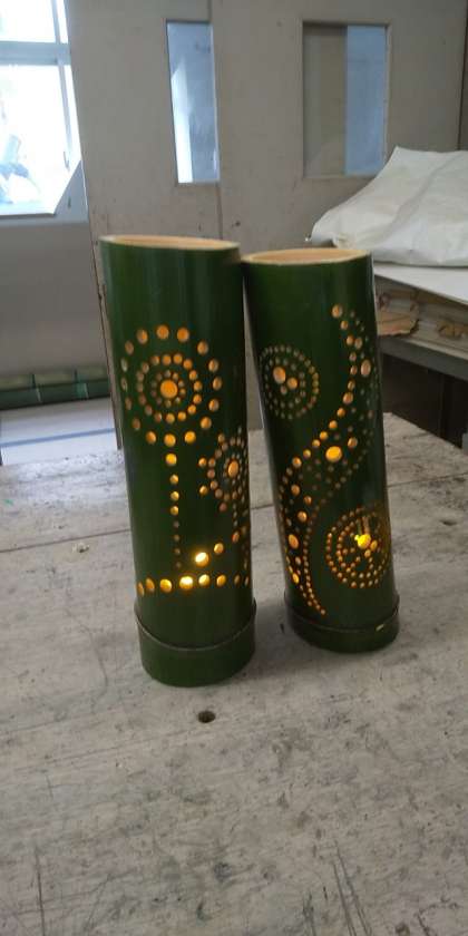 おやじの会・少年補導の皆様のおかげですてきな竹灯籠ができました。少し部屋を暗くして記念写真を撮りました。大変お世話になりありがとうございました。