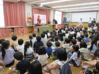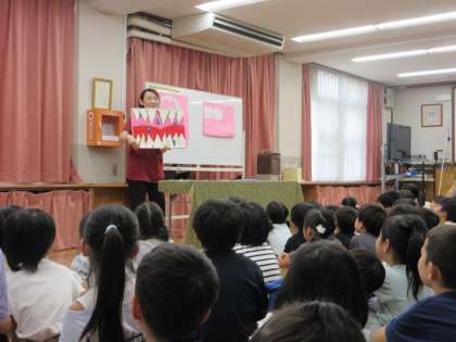 1年生と6くみで、歯科衛生士さんによる、歯磨き巡回指導の学習がありました。歯磨きの大切さや、どのような過程でむし歯になっていくのか、パペットや紙芝居等で分かりやすく教えてもらいました。