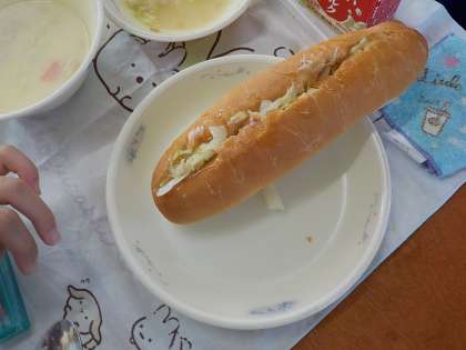 ツナサンドの具(フレンチ味)は、子どもたちが自分でパンを開き、ツナサンドにして食べる献立です。
