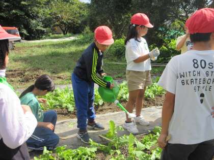 畑の先生にしっかり話を聞いて、がんばりました。水をあげるのも楽しいです。