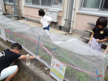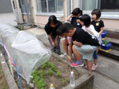 6くみばたけに種まきをした野菜たちの芽がぐんぐん、育っています。