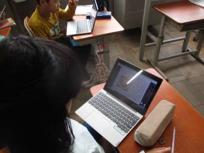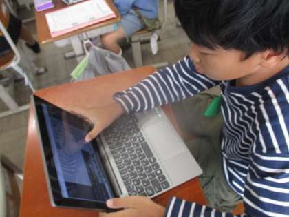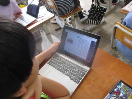 すがたをかえる大豆の学習が終わり、自分たちでほかの食べ物のへんしんを調べて、タブレットや情報カードを用いてまとめました。ローマ字を覚え、タブレットも使いこなせるようになってきました。