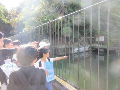 発電所につながるパイプを発見。水力発電を行っていたのですね。