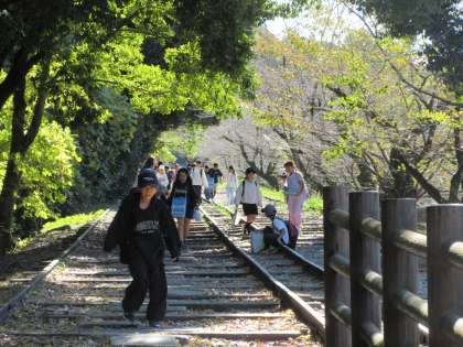 インクラインの線路に沿って歩きました。インクラインの船に荷物が乗っている様子を見ることができました。