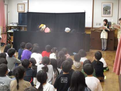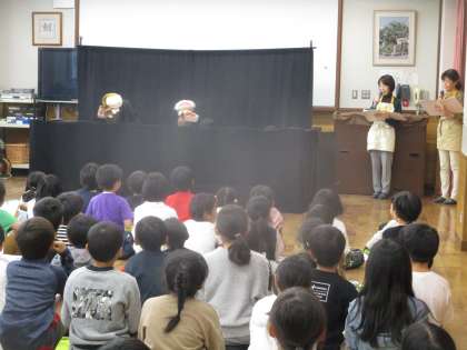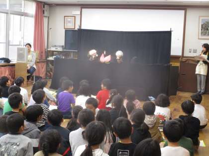 今日は総合の学習で、ゲストティーチャーとしてもこもこさんに来ていただきました。はじめはもこもこさんによるもこもこ劇場で『ももたろう』を見せていただきました。
