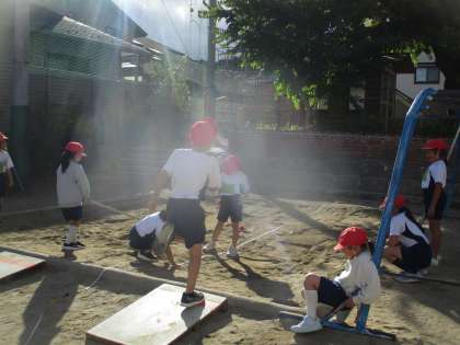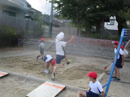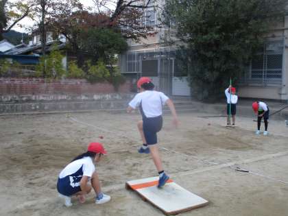 体育で走り幅跳びに取り組んでいます。助走や踏み切りが少しずつ上手になってきて、自分の初めて跳んだときの記録を更新する子も増えてきました。
