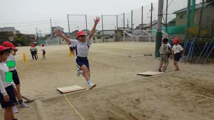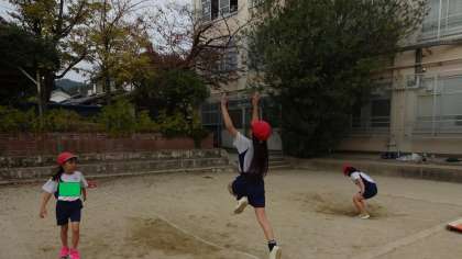 幅跳びの学習をしています。どうすれば遠くへ跳べるか、考えながら学習を進めています。「〇メートル跳びたい!」と、めあてをもって取り組んでいます。