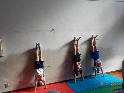 マット運動では、自分にできる技に挑戦しています。