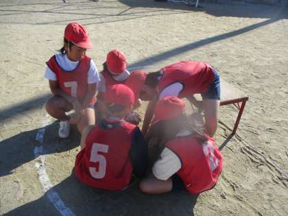 チームで声を掛け合って楽しく活動しています。試合が終わってからは、他のチームの友だちともコツを教え合う姿も見られています。