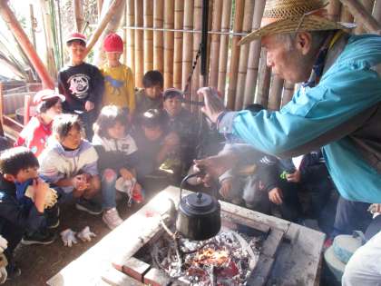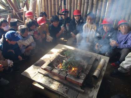 収穫の後は、たき火の近くに集まり、昔の道具の説明や、火事の際に命を守るお話を聞きました。
