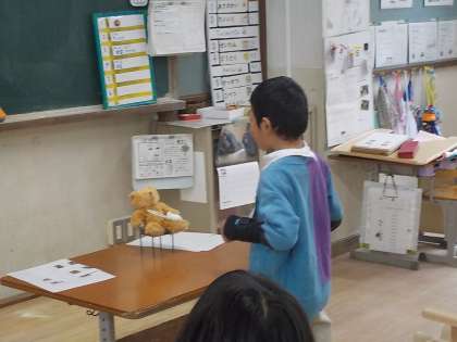 図書館や給食中に大きな声を出したくまおくんに対し、「びっくりしたよ!」「やめてね」と優しく伝えたり、静かに過ごす理由を考えたりしました。