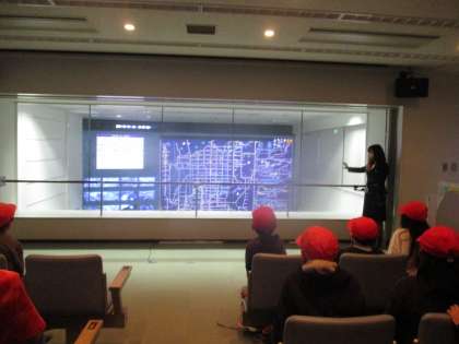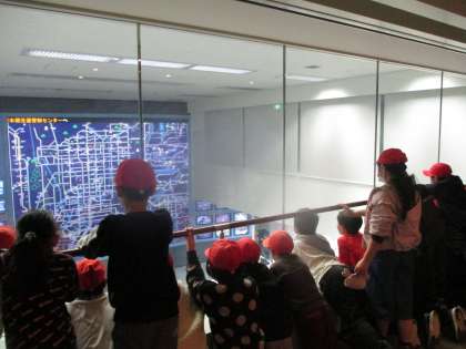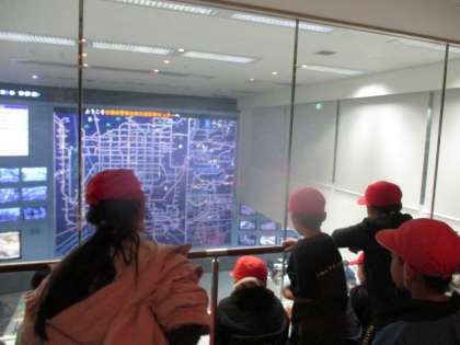交通管制センターでは、交通の流れを一目で確認できる大きなモニターがありました。モニターを見ながら交通状況をラジオで伝えたり、信号の時間を調整したりしていることを教えていただきました。