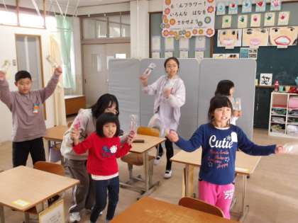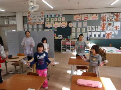 今日、6くみは先週の居住地交流会でつくった「どんぐりマラカス」を音楽科の時間に使いました。そして、みんなで「おもちゃの チャチャチャ」を演奏しました。