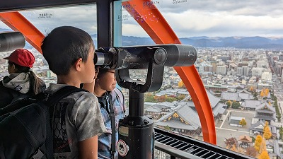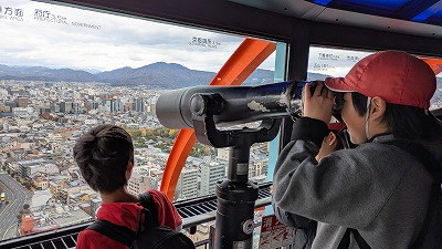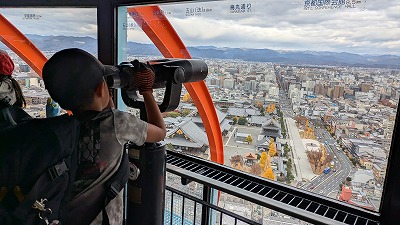 京都タワーへ。望遠鏡で清水寺にたくさんの人がいることに驚いたり、水族館のイルカショーの水槽をみたり、松尾小学校を探したり・・。遠くの大阪のビル群をみたりして、東西南北の様子を確かめました。