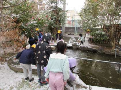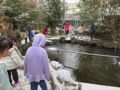 凍った池の表面に雪がつもって「不思議やな〜」と言っている子もいました。