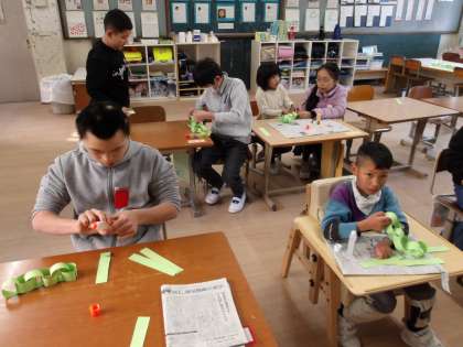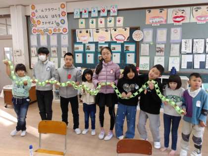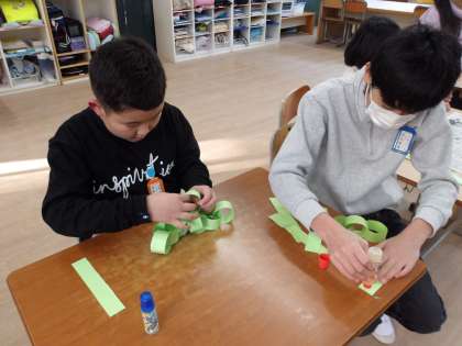 今年は巳年です。6くみでは、図画工作科の時間に1人10この色画用の紙輪っかをつくり、それをみんなでつなげ、大きなヘビをつくりました。