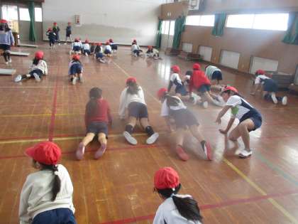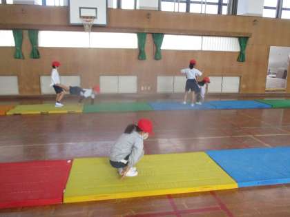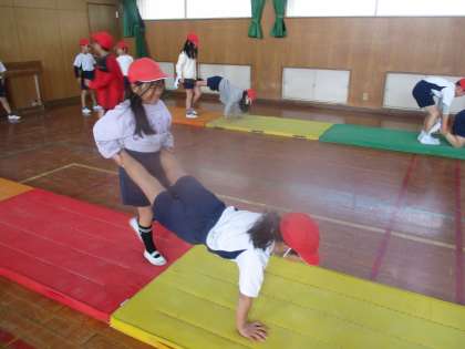 体育でとび箱の学習がスタートしました。少しずつ高い段や新しい技に挑戦しています。今日は台上前転の練習をしました。