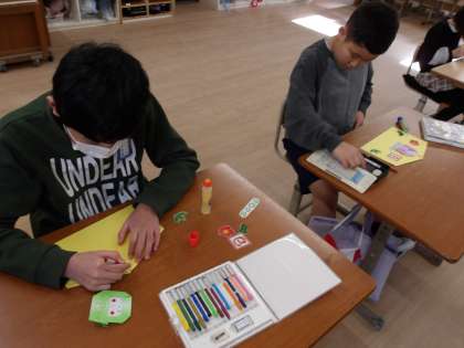 6くみは図画工作科の学習の時間に色画用紙や折り紙などを使って、絵馬をつくりました。