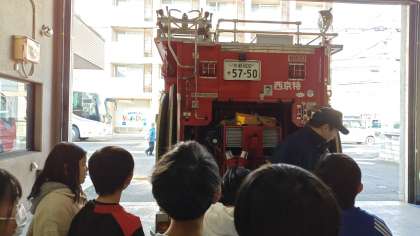 消防車出動の要請がくる部屋や、消防車を見せていただきました。