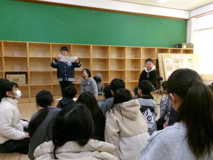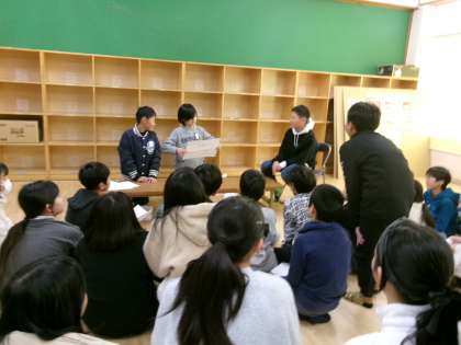 おわらいの会社が「なぞかけ」でお題をだしていました。お客となる6年生が「そのこころは」の続きを考え次々と手を挙げて発表していました。
