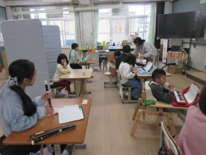 「ありがとうの花」では、鍵盤ハーモニカ・リコーダー・鈴の各パートに分かれて練習をしています。