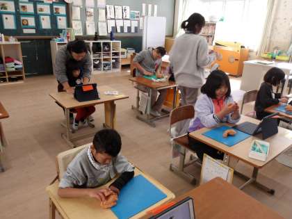 素焼風紙粘土をこねたり・・ひも状に伸ばしたり・・ちぎったり・・。