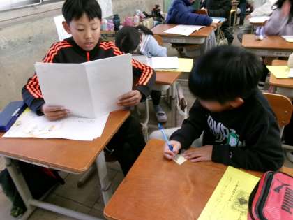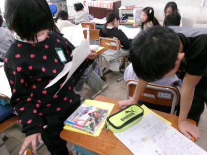 楽しくぼうけん物語を書き進め、今日は友だちと作品を読み合い感想を伝え合いました。それぞれの作品は、工夫があって楽しく読めるものばかりでした。