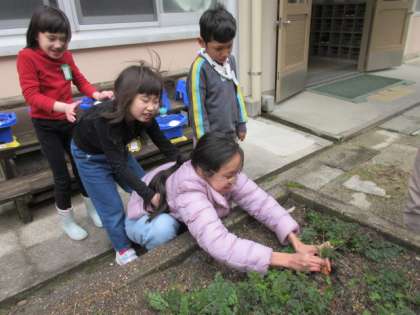 「おおきなかぶ」のお話を思い出した1年生が、みんなに呼びかけました。