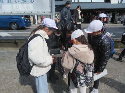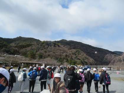 松尾の魅力を伝えるために、嵐山へ行きました。自分たちが調べた松尾の魅力を伝え、紹介の後には行ってみたいと思うところを聞きました。前回のインタビューよりも多くの人に話すことができました。松尾の良さをたくさんの人にに知ってもらえてよかったです。