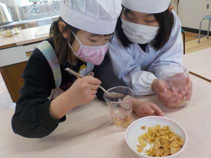 6くみは7日(金)の5時間目に6年生お祝いクッキングに取り組みました。6年生のリクエストで今年もパフェを作りました。(お買い物は5日(水)に行きました)