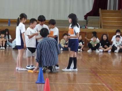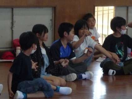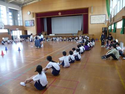 この日は,学年で体育館にてキャンプファイヤーでするゲームの練習をしていました。