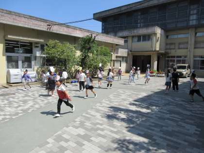 お面を身につけて広場で遊びました。