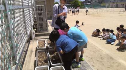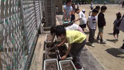 5月13日の理科の学習では、たねの一生はどうなるかを予想しました。そして、実際に観察して調べるため、プランターにたねを植えました。たねはヒマワリとホウセンカの2種類です。