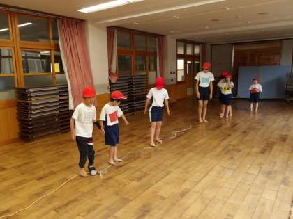 みんなで「まねっこあそび」をしたり、「歩きおにごっこ」をしたりしました。また、2本のなわとびを繋ぎ合せた1本道を「6くみにんじゃ」になって、進みました。