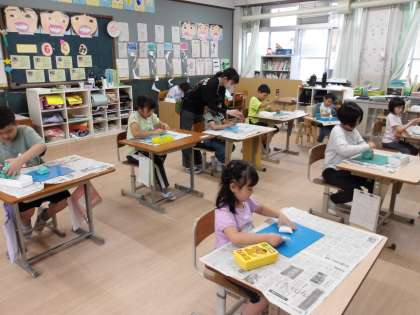 6くみでは、図画工作科「ねんどと なかよし」に取り組みました。今年度初めて油粘土を使った学習ということで・・まずは、みんなで「ねんどたいそう」の始まりです。