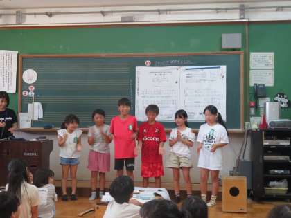 リズムに合わせて、手拍子をつけました。並び方や動きを工夫し、グループで息を合わせることができました。