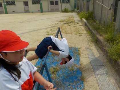 体育の学習で鉄棒をしました。両手でしっかり鉄棒を持ち、ぶら下がりや前回りなど、できる技に挑戦しました。それぞれ自分の目標に向かって頑張りました。