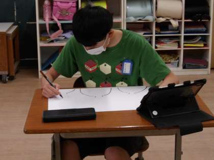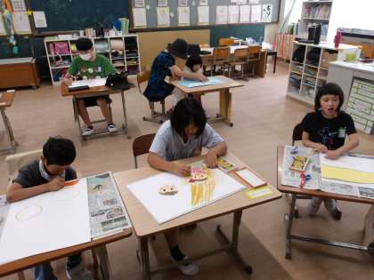 サインペンで描く人、パスで描く人、貼り絵に取り組む人、みんなそれぞれのやり方で学習に取り組んでいます。