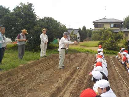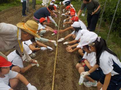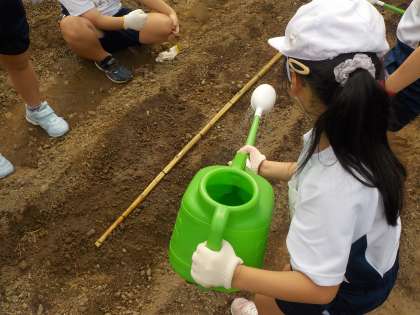 地域の方に教えてもらいながら、大根の種を植え、水をまきました。