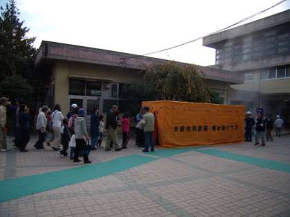 まず,第一次訓練を各自治会で行い,9時過ぎからは,第二次避難場所である松尾小学校で行いました。