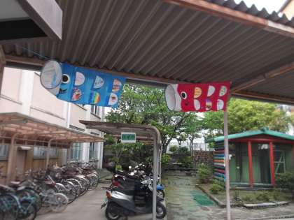6くみの子どもたちが製作した、鯉のぼりが北校舎と中校舎のわたり廊下に飾られています。