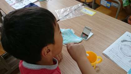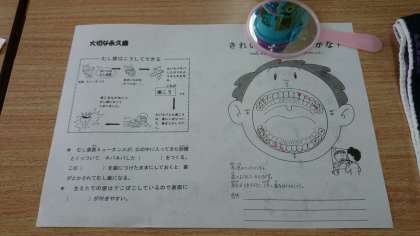 今日は6くみではみがき指導をしました。薬剤で口の中の汚れを赤くして,鏡で見ながら一生懸命磨いていました。